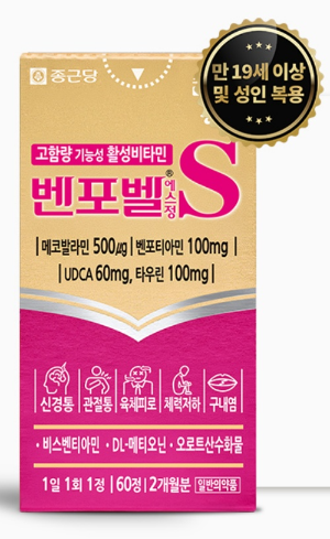 벤포벨 에스정은 고함량의 활성비타민 B군으로 일반의약품으로 속합니다. 피로해소와 신경 건강, 간 기능 개선에 포커스를 맞춘 제품으로 만 19세 이상부터 섭취가 가능한 약국 영양제입니다. 현대인들이 가장 피로하다고 느끼는 육체피로와 근육통, 눈의 피로를 완화하는데 도움이 되고 피곤하면 쉽게 생기는 구내염을 예방하는데 도움이 될 수 있습니다.